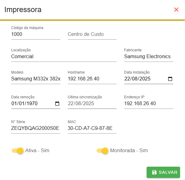 AtivaeMonitorada. Preencher os campos deCódigo de máquinaCentro de custoeLocalizaçãosão opcionais