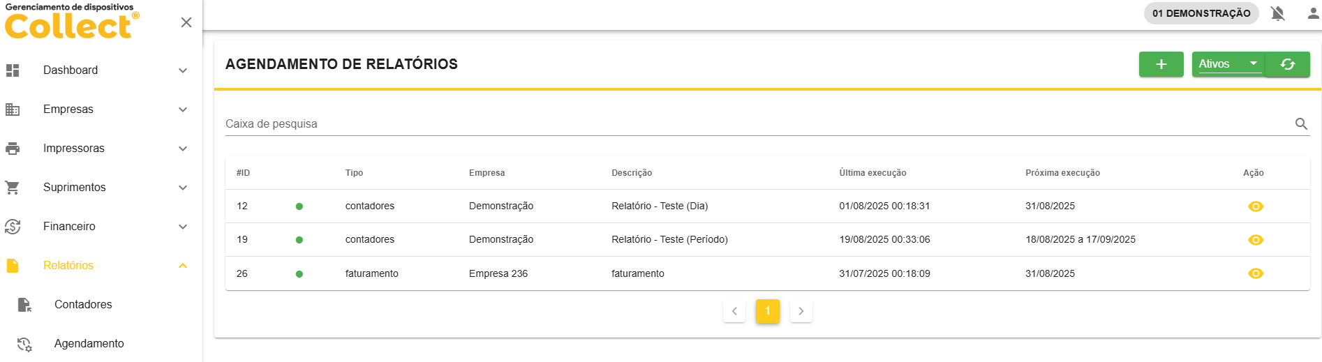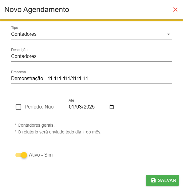 Tipode agendamento, aEmpresa, oPeríodoe marque comoAtivo