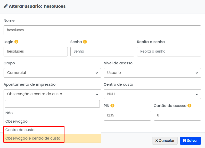 No cadastro do usuário o Apontamento de impressão precisa estar com as opções de Centro de custo ou Observação e centro de custo