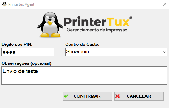 A parti de agora ao enviar uma impressão será aberto o pop-up para inserir o PIN, centro de custo e Observação