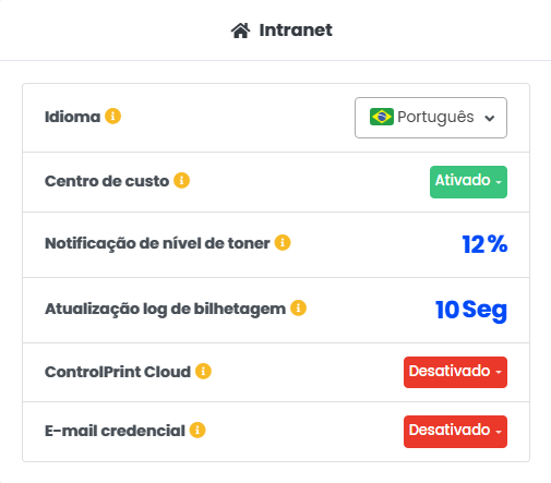 No ControlPrint navegue pelo menu Configurações >> sistema. Na guia intranet ative a opção de centro de custo