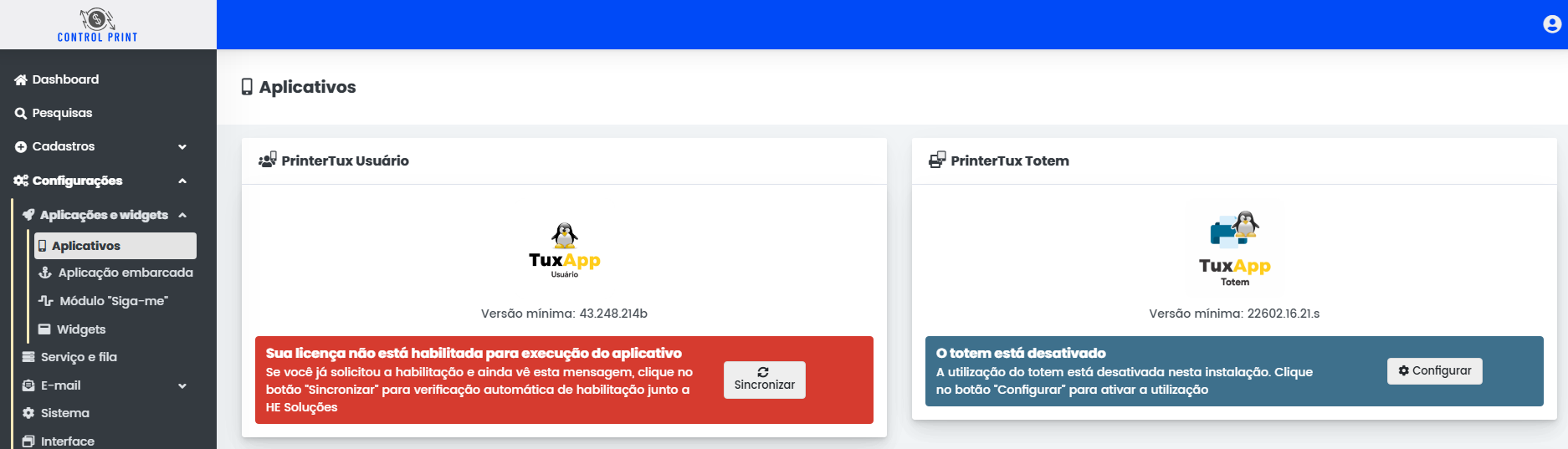 No ControlPrint navegue pelo menu Configurações >> Aplicações e widgets >> Aplicativos. Caso a licença não esteja habilitada, solicite ao suporte a liberação e clique em sincronizar