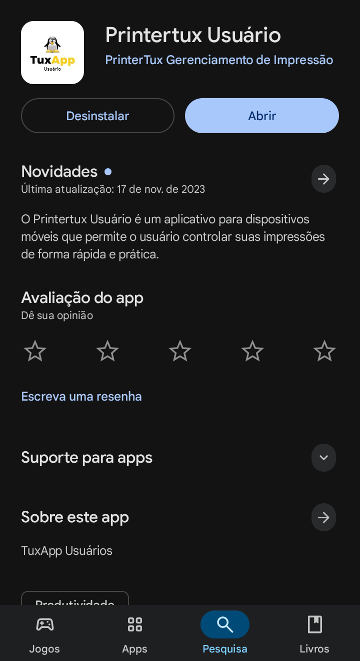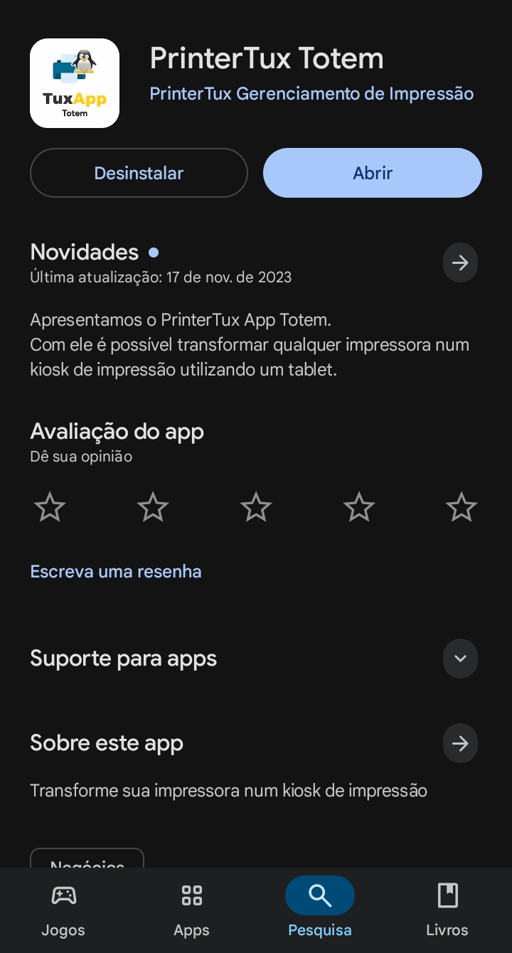 Acesse a Google Play Store e baixe o aplicativo. Ou acesse diretamente atráves do link https://play.google.com/store/apps/details?id=com.he.solucoes.PrinterTuxToten
