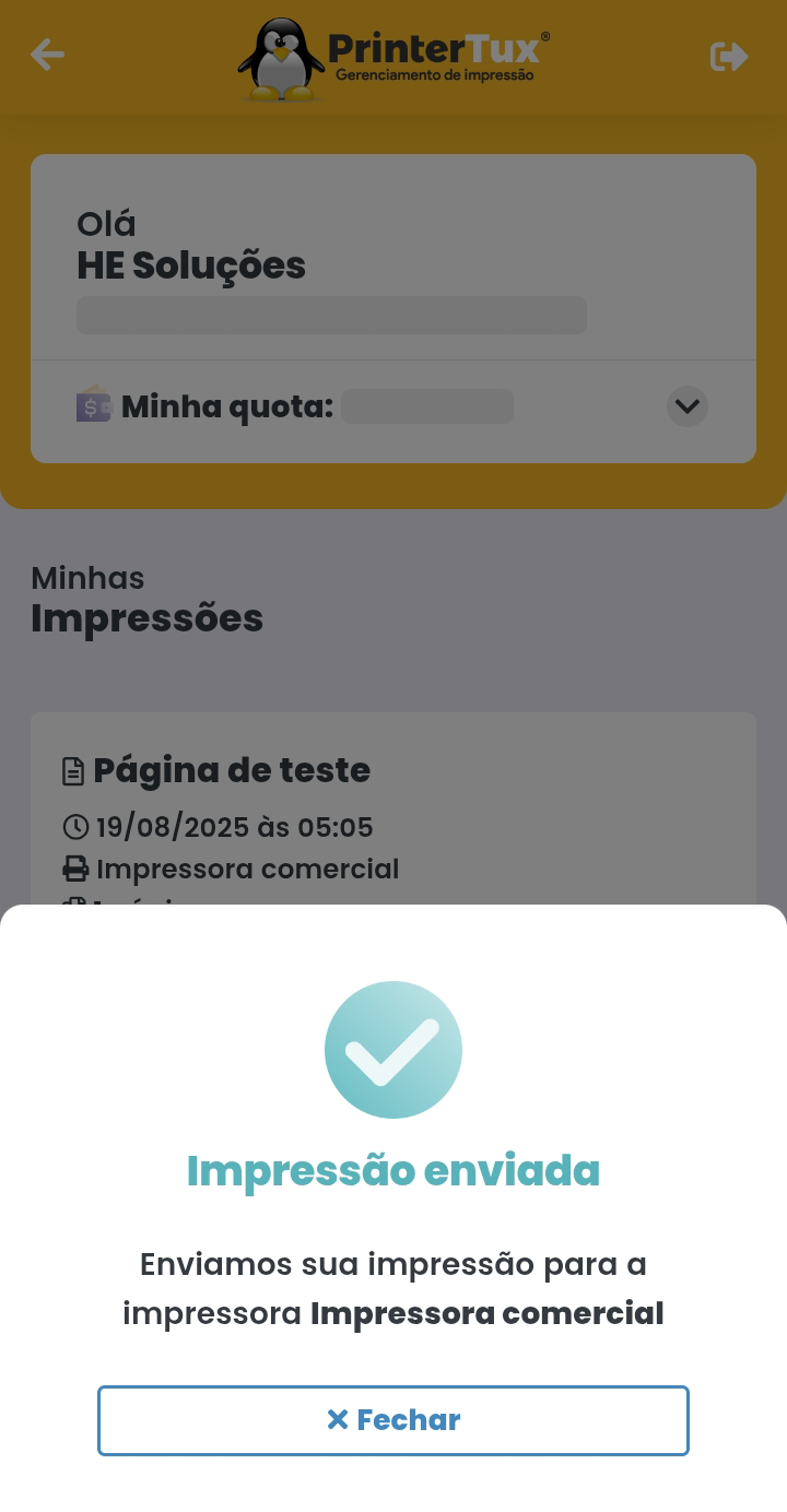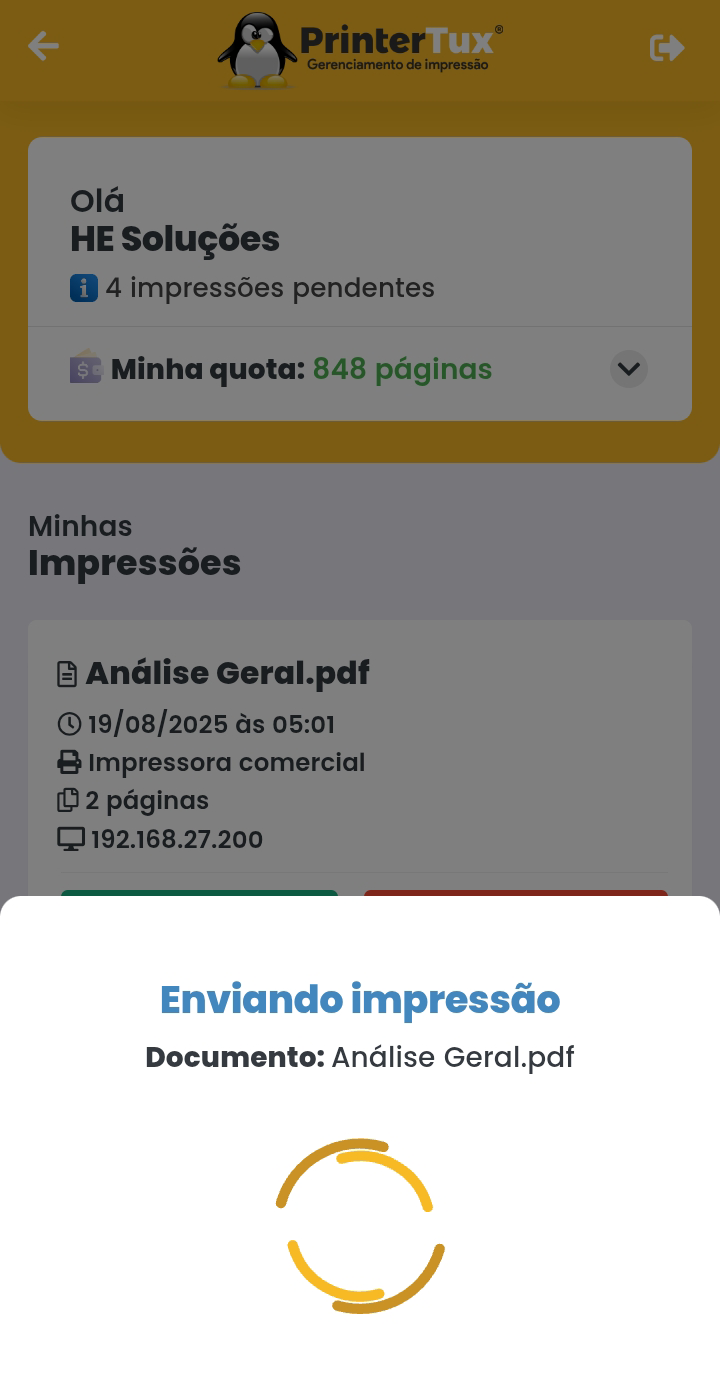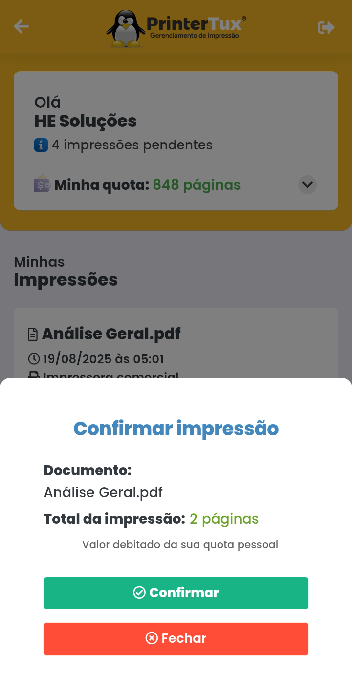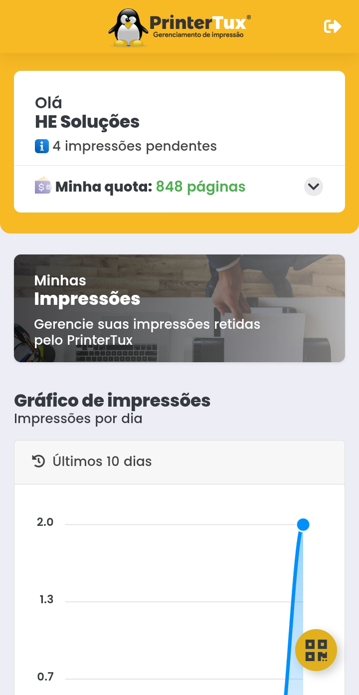 Ao acessar o aplicativo é possível visualizar informações como impressões pendente, cota e gráfico de impressões