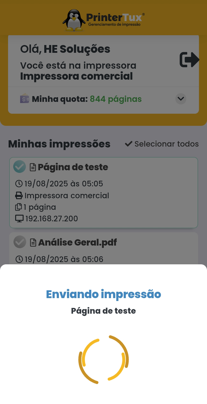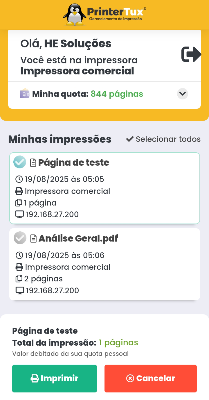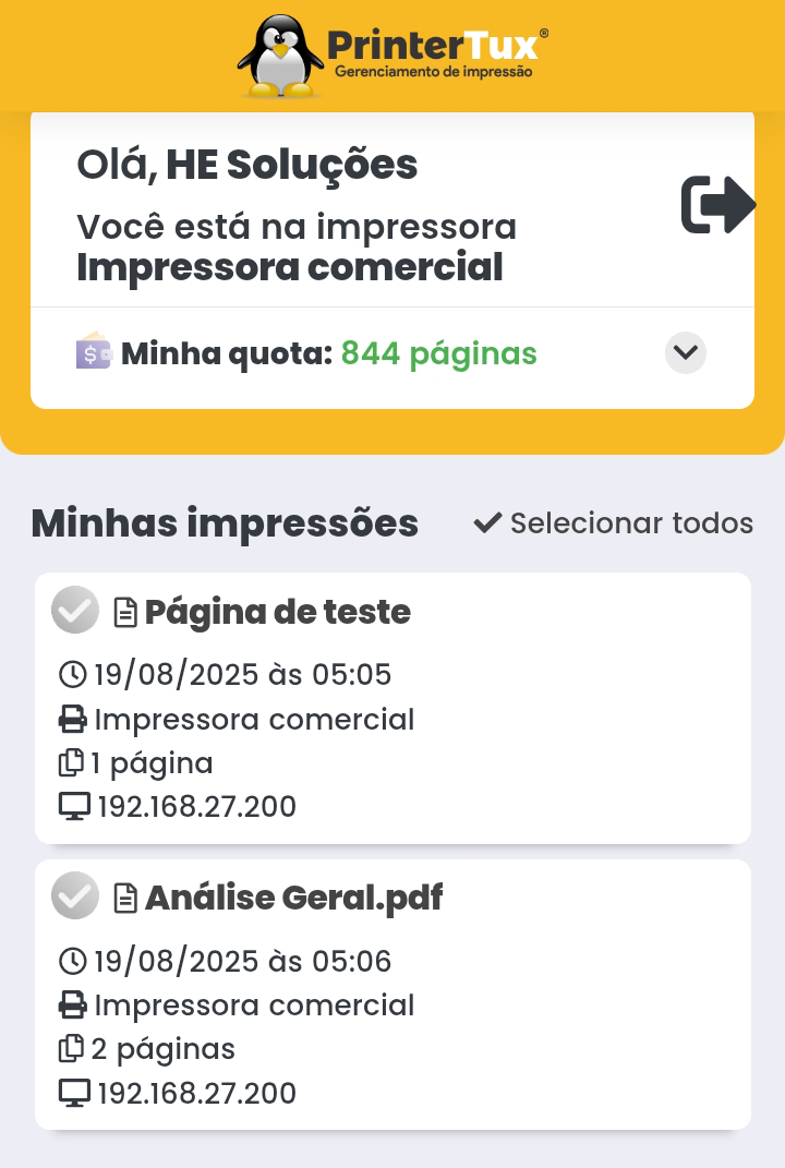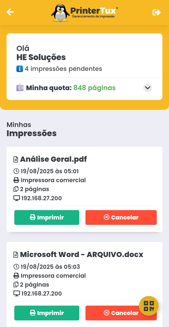 Ao acessar o aplicativo é possível visualizar informações como impressões pendente, cota e gráfico de impressões