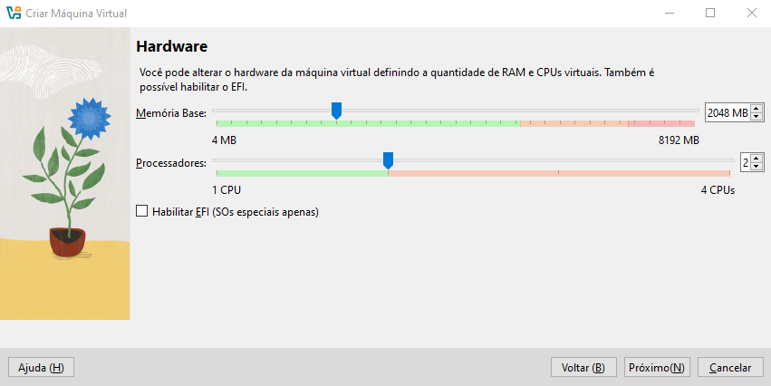 - Defina o tamanho da memória RAM e núcleos de CPU: