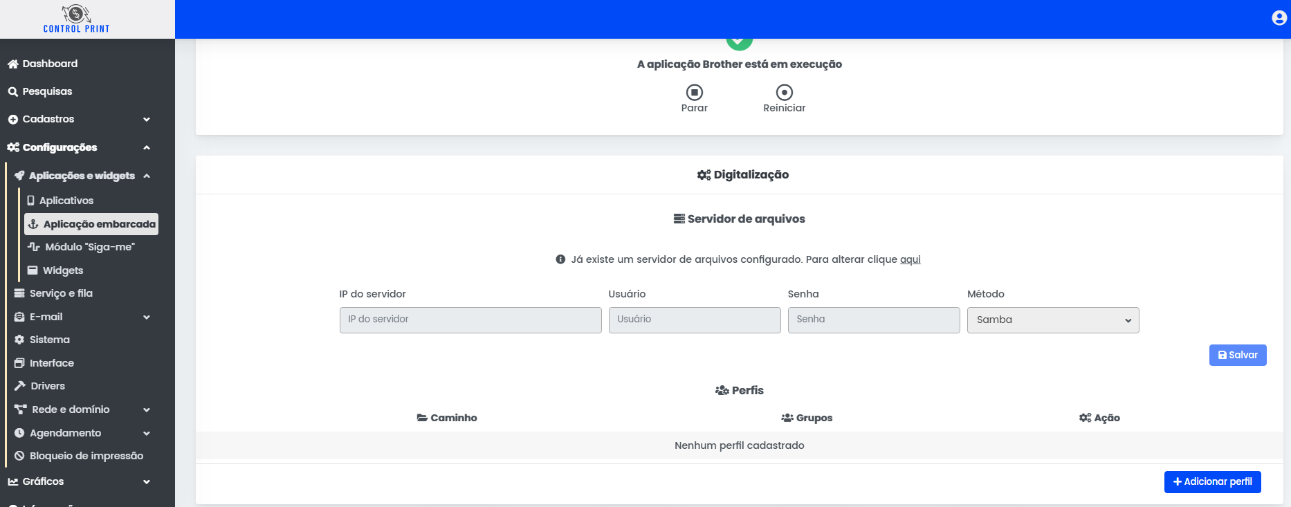 No ControlPrint navegue pelo menu Configurações >> Aplicações e widgets >> Aplicação embarcada