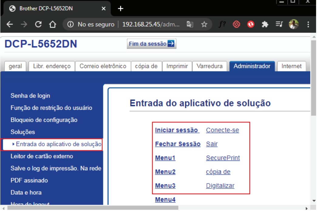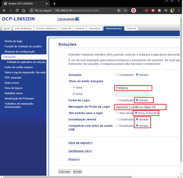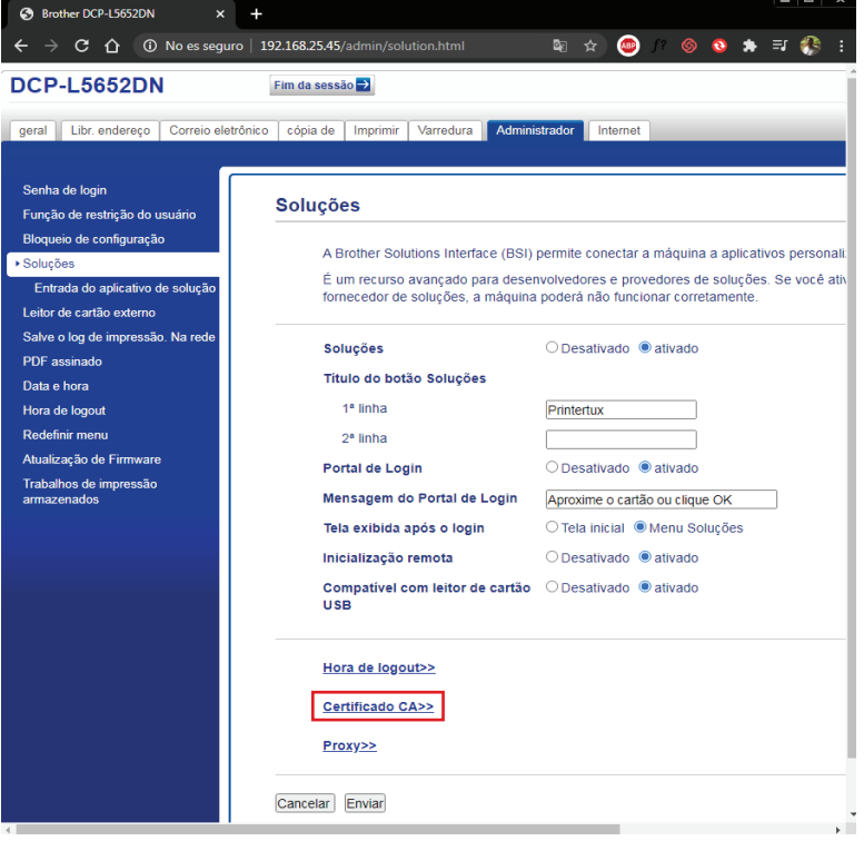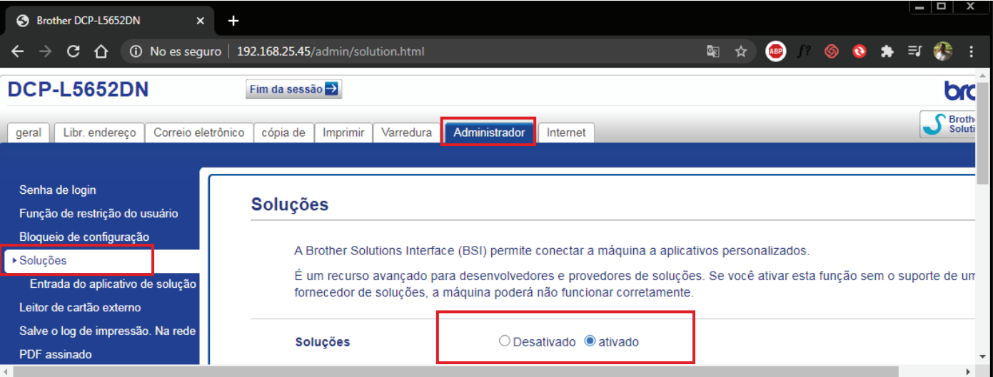 Clique na aba Administrador, selecione no menu lateral a opção Soluções e ative a solução BSI da impressora.