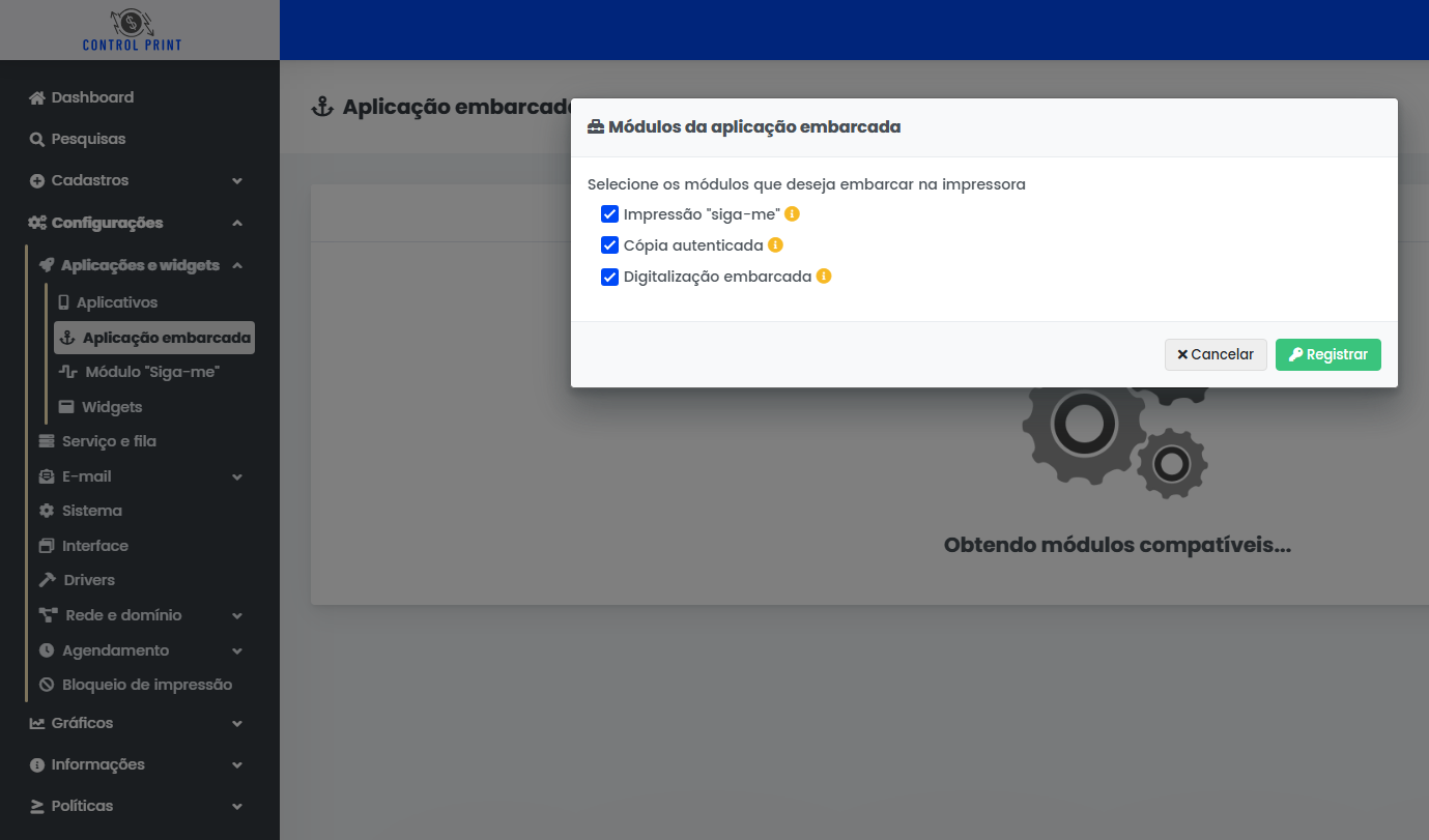 - No ControlPrint navegue pelo menu Configurações >> Aplicações e widgets >> Aplicação embarcada