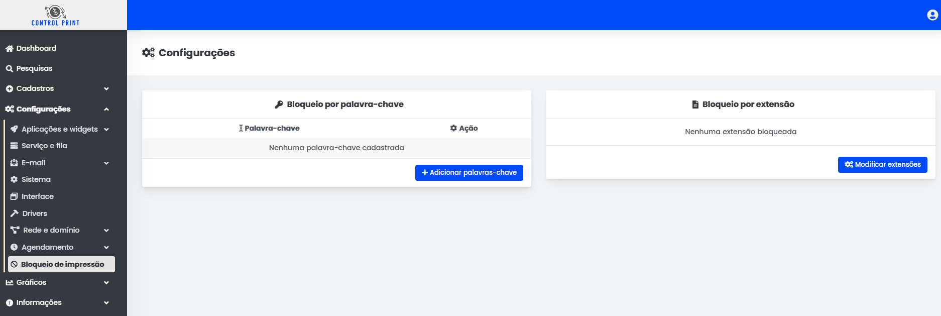 No ControlPrint navegue pelo menu Configurações >> Bloqueio de impressão
