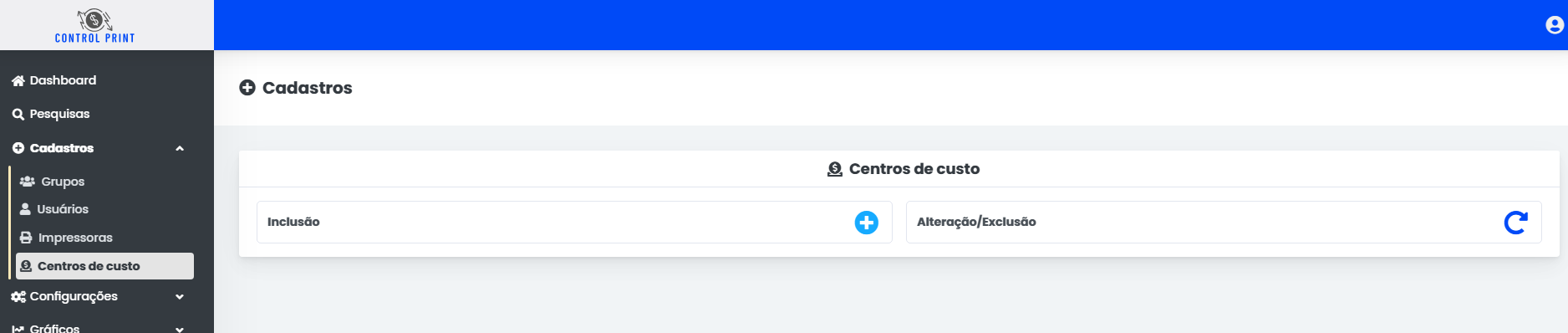 No ControlPrint navegue pelo menu Cadastros >> Centros de custo