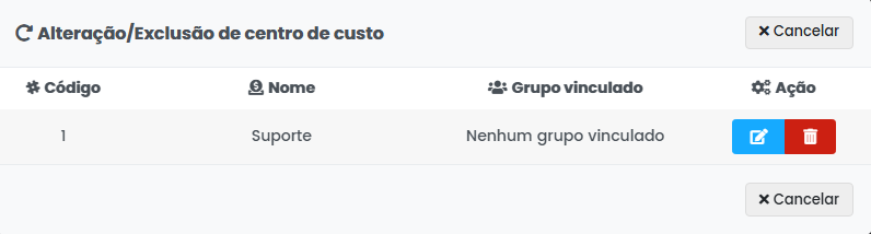 - Clique em Alteração/Exclusão para verificar, editar ou excluir os centro de custo existente.