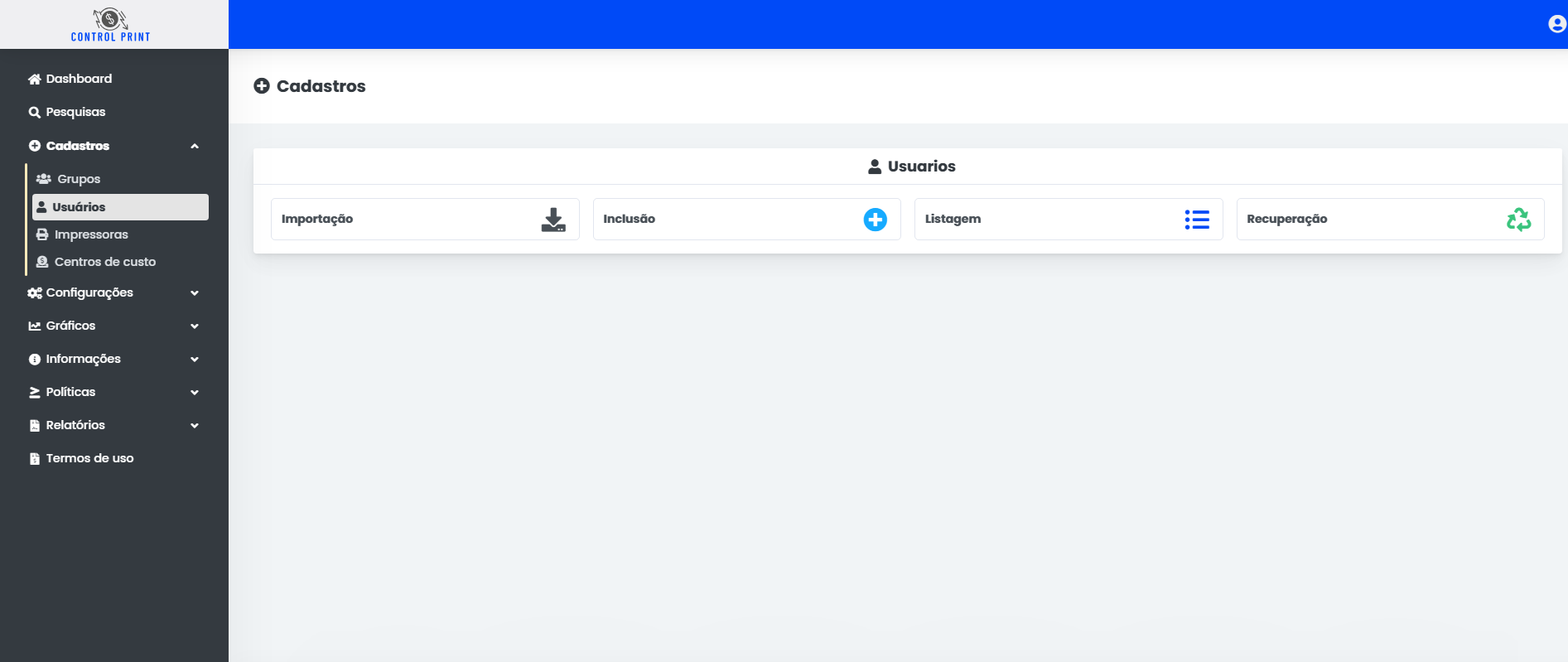 No ControlPrint navegue pelo menu Cadastros >> Usuarios
