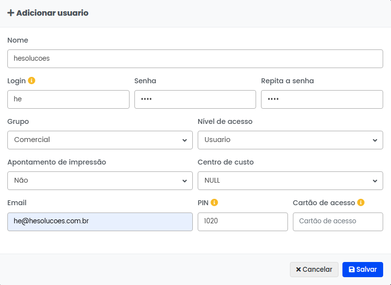 Cartão de acesso: Quando utilizado cartão RFID deve ser cadastro aqui o código do cartão