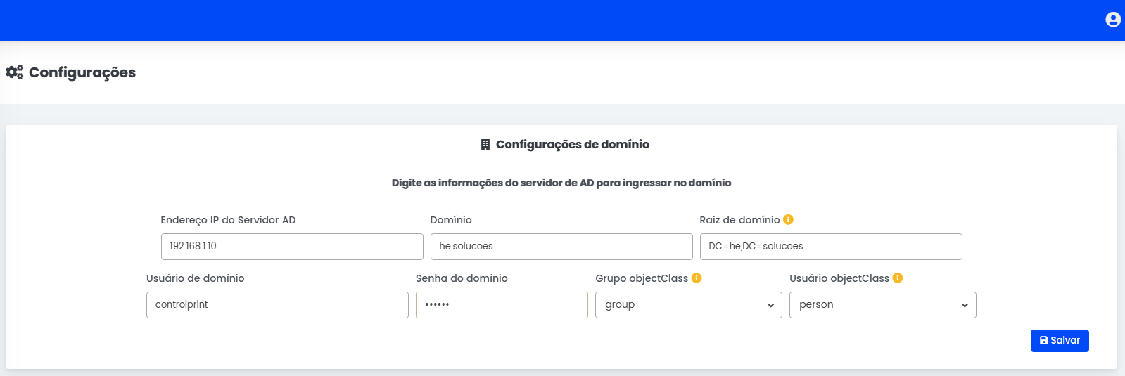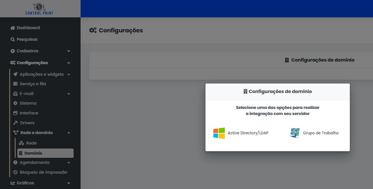 No ControlPrint navegue pelo menu Configurações >> Rede e domínio >> Domínio e selecione o tipo de integração