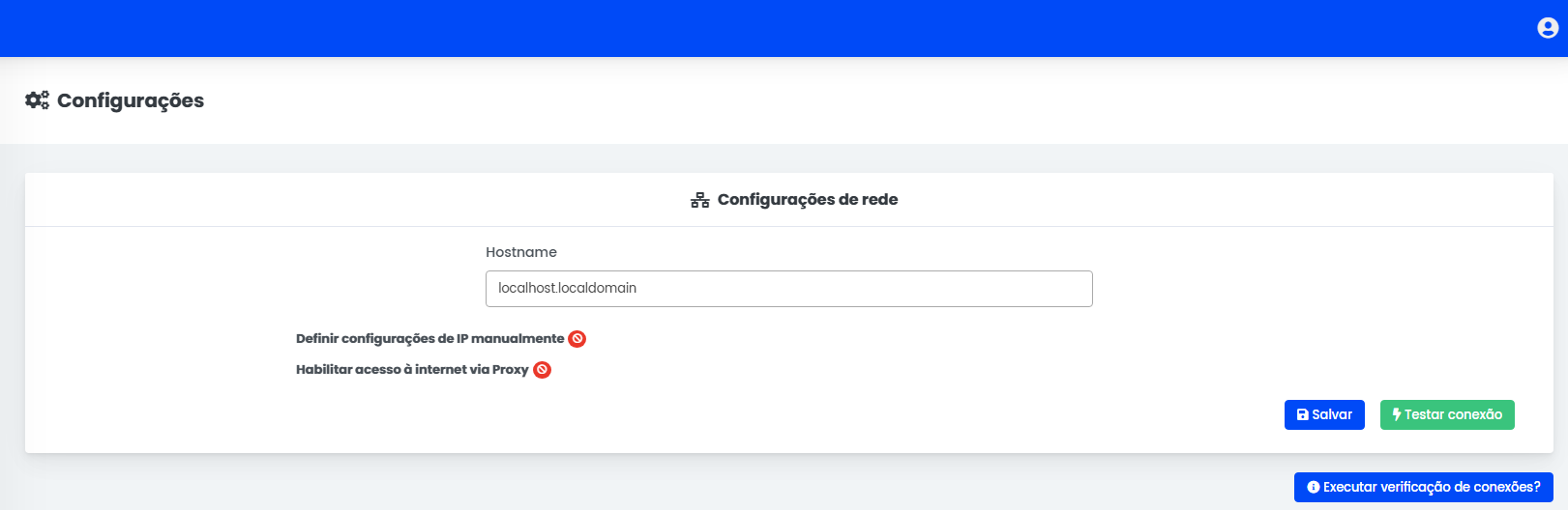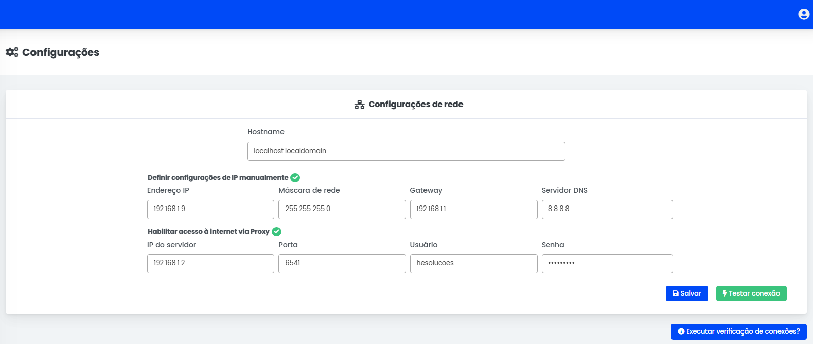 É possível configurar IP estático, proxy e testar a rede no servidor